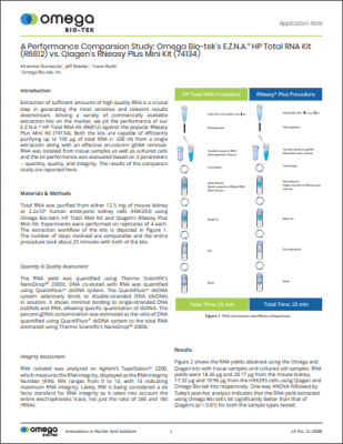 Total RNA was purified from either 12.5 mg of mouse kidney or 2.2×106 human embryonic kidney cells (HEK293) using Omega Bio-tek’s HP Total RNA Kit and Qiagen’s RNeasy Plus Mini Kit. Experiments were performed on replicates of 4 each. The extraction workflow of the kits is depicted in Figure 1. The number of steps involved are comparable and the entire procedure took about 25 minutes with both of the kits.
