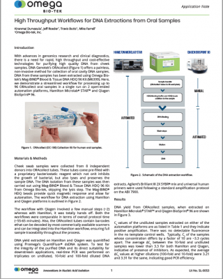 Cheek swab samples were collected from 8 independent donors into ORAcollect tubes. These tubes come pre-filled with a proprietary bacteriostatic reagent which not onlt inhibits the growth of bacterial, but also lyses and preserves the sample DNA. The DNA isolation from these samples was then carried out using Mag-BIND® Blood & Tissue DNA HDQ 96 Kit from Omega Bio-tek, skipping the lysis step. The Mag-BIND® HDQ beads provide quick magnetic response and allow for automation. The workflow for DNA extraction using Hamilton and Qiagen platforms is outlined in Figure 2.