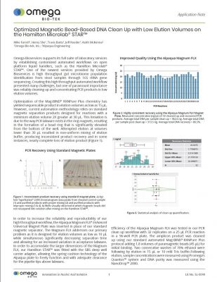 Omega Bioservices supports its full suite of laboratory services by establishing customized automated workflows on open platform liquid handlers, such as the Hamilton Microlab® STAR™. One of the newest services provided by Omega Bioservices is high throughput gut microbiome population identification from stool samples through 16S rRNA gene sequencing. Creating this high throughput automated workflow presented many challenges, but one of paramount importance was reliably cleaning up and concentrating PCR products in low elution volumes.
