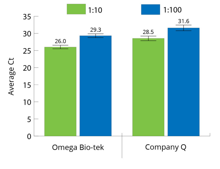 Figure 3. DNA was extracted from 250 µL whole blood using Omega Bio-tek’s E.Z.N.A.® Blood DNA Mini Kit and eluted in 200 µL. DNA was also extracted from 200 µL whole blood using an equivalent kit from Company Q, following manufacturer’s protocol. Average Ct values were acquired using Applied Biosystems’ QuantStudio™ 3 Real-Time PCR System.