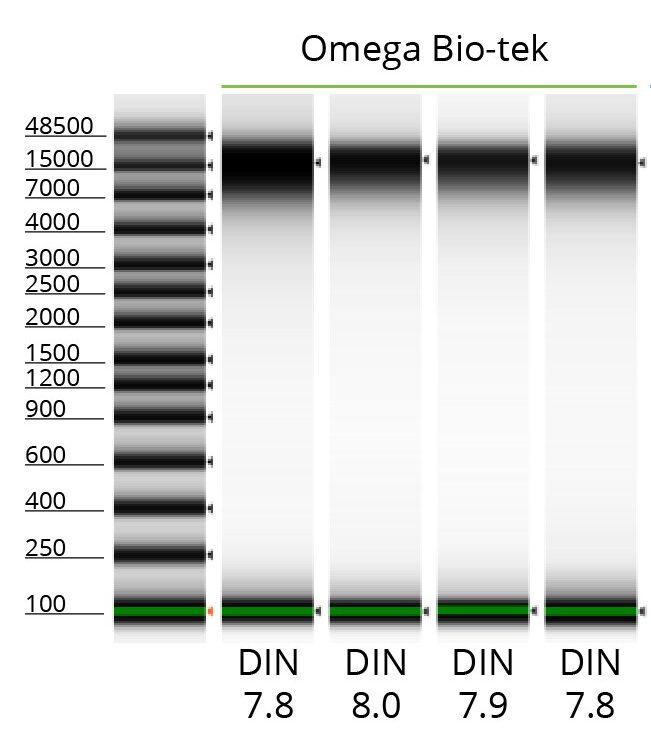 Figure 2. DNA was extracted from 250 µL whole blood using Omega Bio-tek’s E.Z.N.A.® Blood DNA Mini Kit and eluted in 200 µL. DNA was also extracted from 200 µL whole blood using an equivalent kit from Company Q, following manufacturer’s instructions. DNA integrity was anlayzed via Agilent’s TapeStation® 4150. DNA concentrations for Company Q were outside the recommended range for the TapeStation.