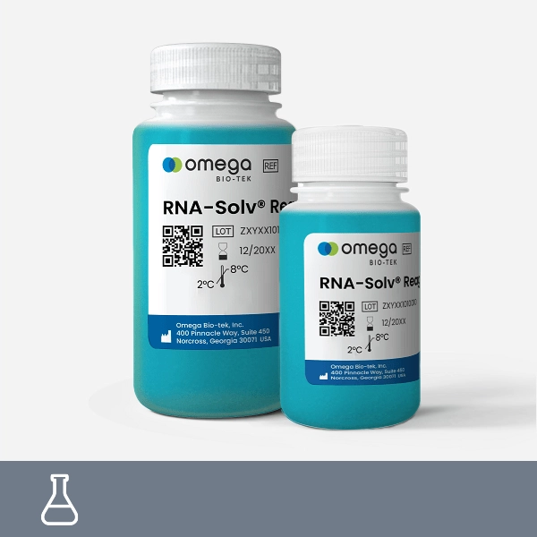 RNA-Solv® Reagent is a one reagent system for the isolation of total RNA from cells and tissues. The reagent, a single-phase solution consisting of phenol and guanidine isothiocyanate, is a modification of the single-step RNA isolation method developed by Chomczynski and Sacchi (1). The sample is homogenized and lysed in RNA-Solv® Reagent which maintains the integrity of the RNA while disrupting and denaturing endogenous RNases and other cellular components. Extraction of the lysate with chloroform further denatures proteins and separates the mixture into an organic and an aqueous phase. RNA remains exclusively in the aqueous phase and is subsequently recovered by isopropanol.