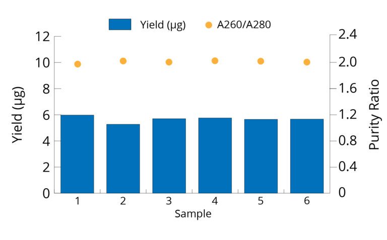 Figure 1. Total RNA was isolated from 1 x 106 AD293 cultured cells using RNA-Solv® Reagent and eluted in 50 µL. RNA concentrations were quantified via Thermo Scientific’s NanoDrop® 2000c. A260/A280 ratios were approximately 2.0, consistent with high-purity RNA suitable for various downstream applications.