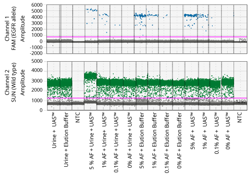 Figure 3. Visualization of the positive and negative droplet populations of the EGFR assay at different experimental groups. The threshold is indicated with a pink horizontal line.