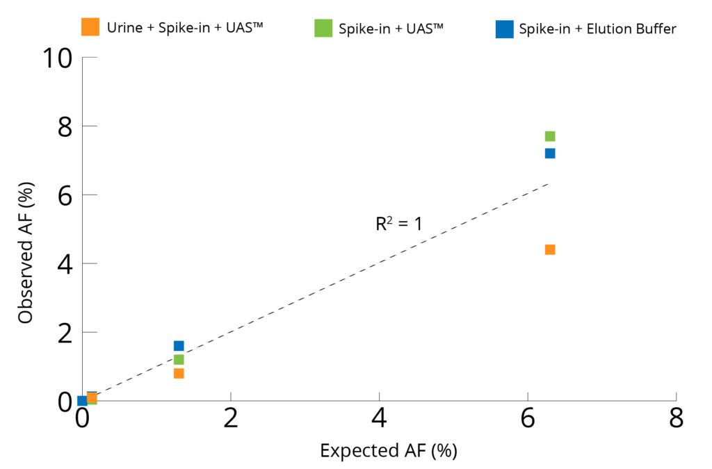 The number of positive droplets at each allelic frequency was summed and compared to the expected allelic frequency to check for concordance between actual vs expected. The results of the concordance analysis for NRAS and EGFR genes are shown in Figures 4 and 5, respectively. The observed allelic frequencies for NRAS gene are in concordance with the expected allelic frequencies for all the experimental groups tested and well within the acceptance criteria mentioned on the Certificate of Analysis of the reference standards (spike-in) set by the manufacturer. A similar trend was observed with EGFR assay except for when reference standard at 5% allelic frequency was spiked into urine preserved in Colli-Pee™ UAS™ Preservative. The observed allelic frequency was lower at 2.5% where the acceptance criteria was between 3.5 and 6.5%, likely an experimental error. For all the other experimental groups, EGFR assay shows excellent concordance between observed and expected values. The results indicate cfDNA preserved in Colli-Pee™ UAS™ Preservative and extracted using Mag-Bind® cfDNA Kit (M3298) was capable of detection of mutant alleles at frequencies as low as 0.1% when used in ddPCR workflow.