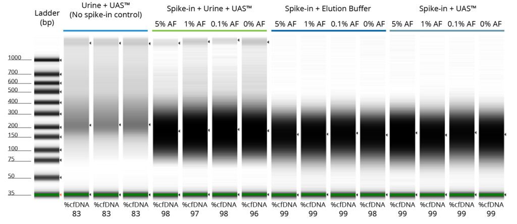 Figure 1. Evaluation of cfDNA extracted from different experimental groups using the Cell-Free DNA ScreenTape Assay on the Agilent 4150 TapeStation system. All conditions resulted in high yields of high-quality cfDNA. AF: Allelic Frequency. UAS: Colli-pee™ UAS™ preservative.